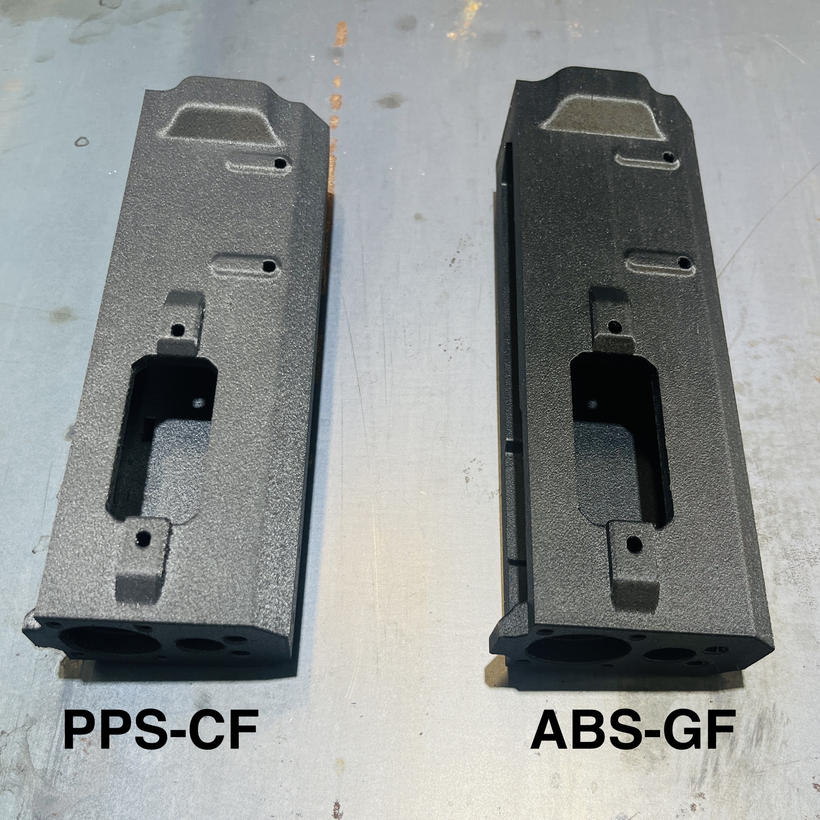 I’m also experimenting with a PPS-CF upper. The design uses thick, uniform walls with no stress concentrations, letting the material’s >200 MPa post-annealed strength and high stiffness handle firing loads and maintain optic zero. So far, it’s holding up on the range. That same textured, layer-free surface comes through beautifully, and printing is just as forgiving. But drop survivability is still unproven—despite the robust geometry, PPS-CF can fracture under sharp impact. This isn’t a drop-in replacement for aluminum; it’s a high-performance prototype where heat tolerance, weight savings, and print quality justify the cost and risk.